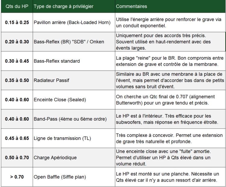 Un autre tableau avec la recommandation du choix de type d'enceinte à réaliser en fonction du Qts de votre HP. (Qts fait partie des paramètres Thiele & Small que vous déterminer à l'aide du Logiciel LIMP).