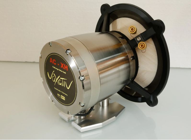 Le modèle présenté sur l'image est le Voxativ AC-XHB, considéré comme le "joyau de la couronne" de la marque berlinoise. C'est un haut-parleur large-bande d'exception qui repousse les limites de la technologie à excitation.