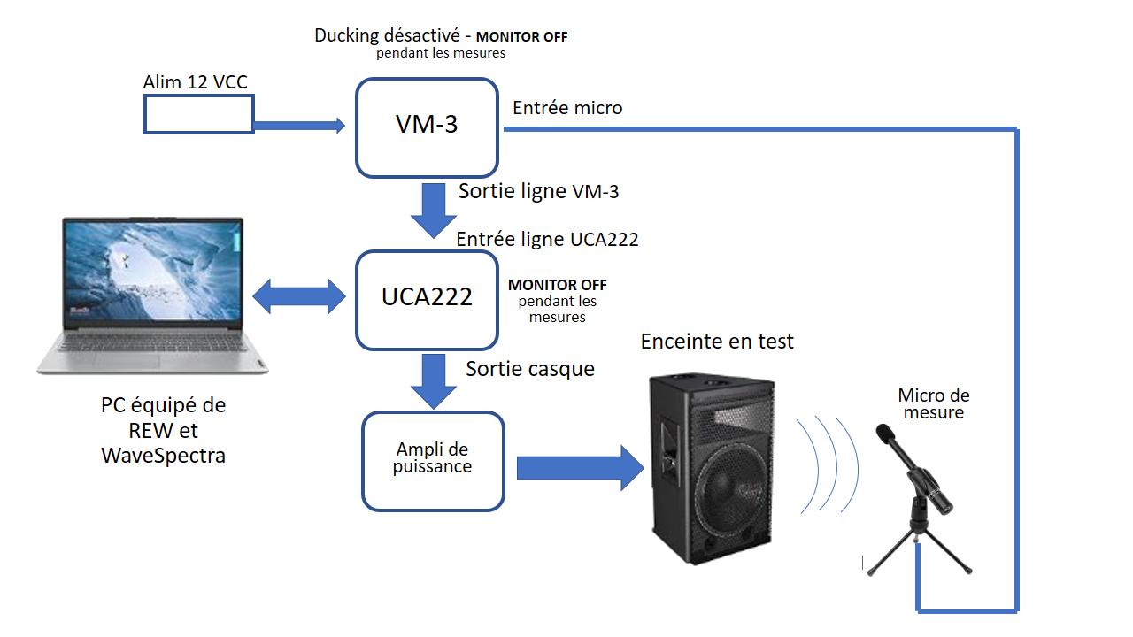 VM-3 + UCA222, l'objectif est de créer un fichier de compensation qui signifiera au logiciel (REW ou WaveSpectra) d'ignorer les défauts du matériel et de n'afficher que le son de l'enceinte.