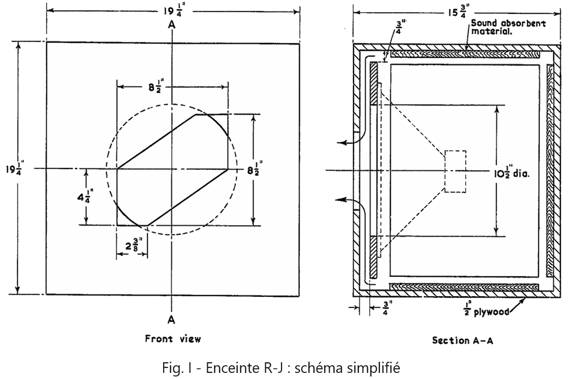 Enceinte Robbins-Joseph (R-J) : C'est une variante ancienne de l'enceinte close ou BR avec une ouverture frontale spécifique (souvent en forme de citron ou de rectangle) devant le haut-parleur. Elle est adaptée aux HP ayant un Qts moyen (0.40 - 0.50).